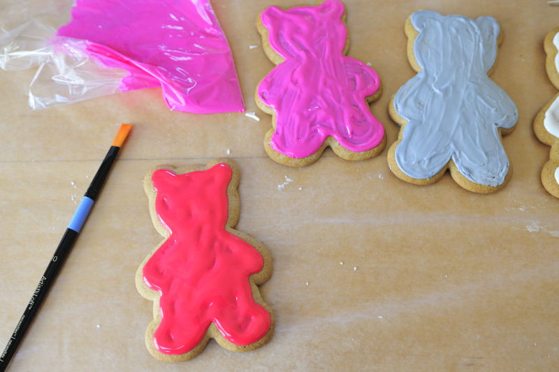 - Then pipe or spoon some of the 10 second icing onto the cookie and using a brush spread it around into a thin layer.Let dry. If needed wipe the brush in paper towel.