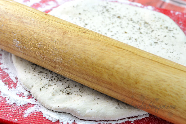Simply using your hands smooth out the pizza ball until you have a pizza shape formed. At this point I like to sprinkle dry herbs(basil or herbs of Provence) on the top of the flatten pizza dough and run a rolling pin over.
