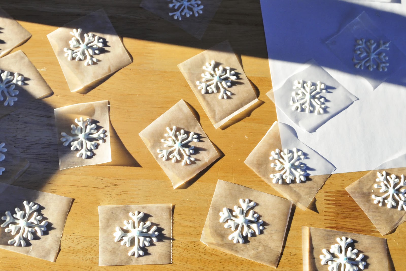 - Let cool snowflakes without touching until firm, I usually put them into the fridge for couple of minutes until they harden. Gently peel off the wax paper and set each snowflake on a flat surface or directly onto a frosted cupcake.
