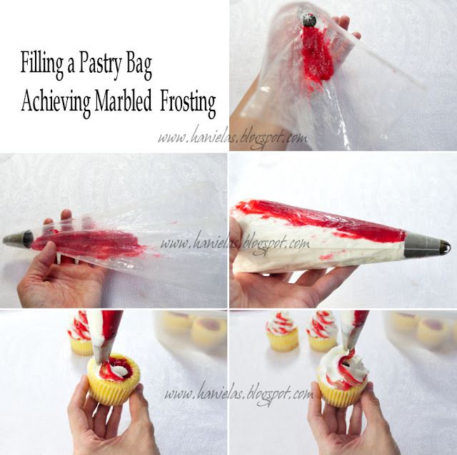 - Achieving a marbling effect with icing is quite easy, using left over raspberry filling, using a spatula ora knife spread the filling in one thick line into your piping bag. See the picture below